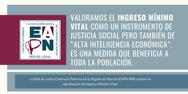 EAPN Región de Murcia, al igual que hizo hace unos días la Red Europea de Lucha contra la Pobreza y la Exclusión Social en el Estado Español (EAPN-ES) de la que formamos parte, celebra la aprobación por el Consejo de Ministros del Ingreso Mínimo Vital, una medida destinada a paliar las situaciones de mayor pobreza y desigualdad en…