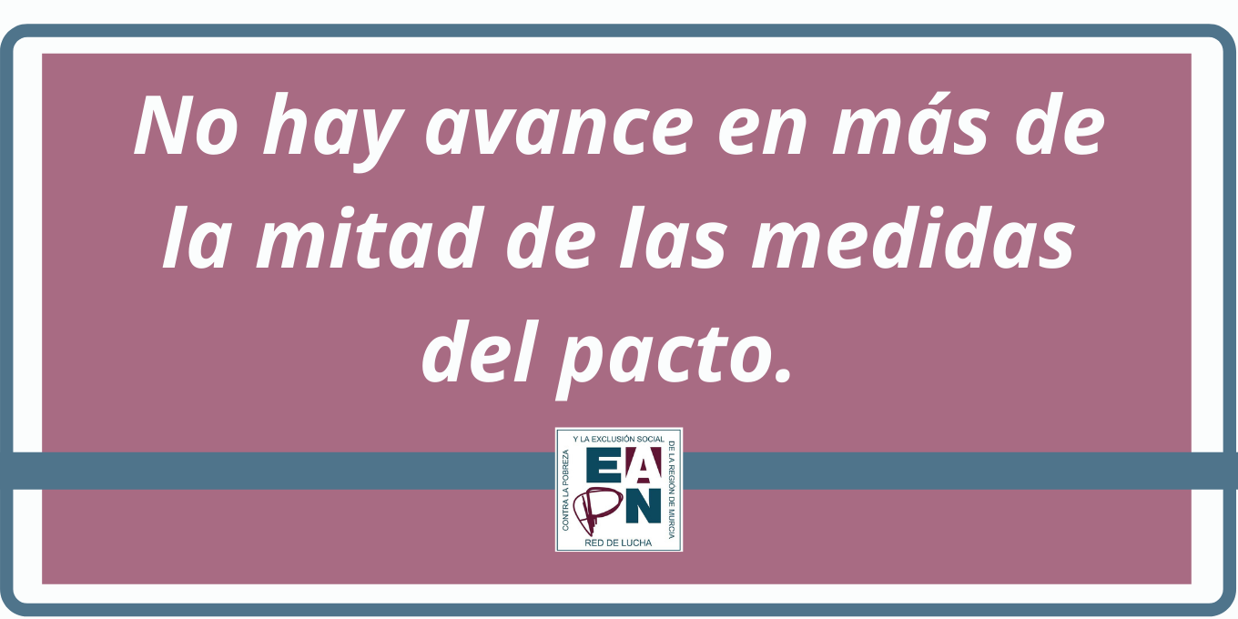 No hay avance en más de la mitad de las medidas del pacto. En concreto, no hemos identificado que se haya hecho nada en relación al 58% de las medidas. En un 18% hay algún grado de cumplimiento. Y solo un 6% de las medidas han sido cumplidas. En valores absolutos: solo 3 de las 50 medidas recogidas en el II Pacto de Lucha Contra la Pobreza en la Región de Murcia se ha cumplido a mitad de legislatura.